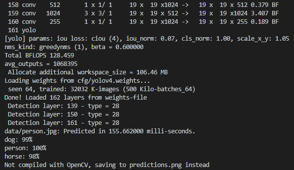 현재 개발환경에 OPENCV가 설치되지 않았기 때문에 data augmentation이 느릴수도 있다는 메세지가 나온다. opencv를 설치하고 makefile 옵션에서 opencv값을 변경하고 빌드하면 자체적으로 augmentation과정이 일어나는 것으로 보인다. 각 레이어에 대한 정보가 나오면서 inference 하는 과정이 나오고 결과 이미지는 prediction.png로 저장이 된다. opencv가 설치되어있었으면 별도의 디스플레이에서 보여주는 것 같다.